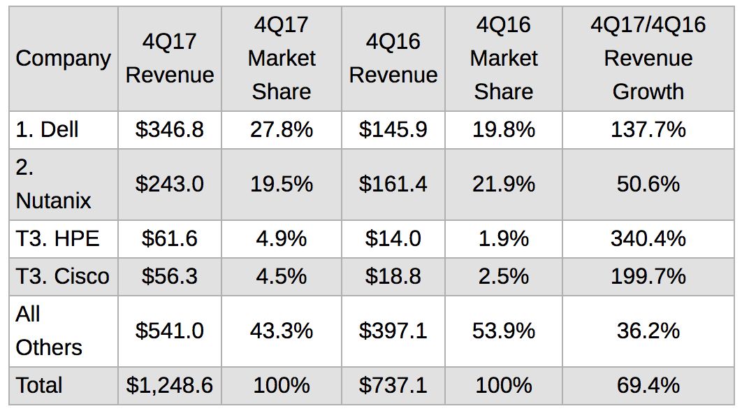 2017年第四季度,戴尔、思科、HPE和Nutanix一决雌雄