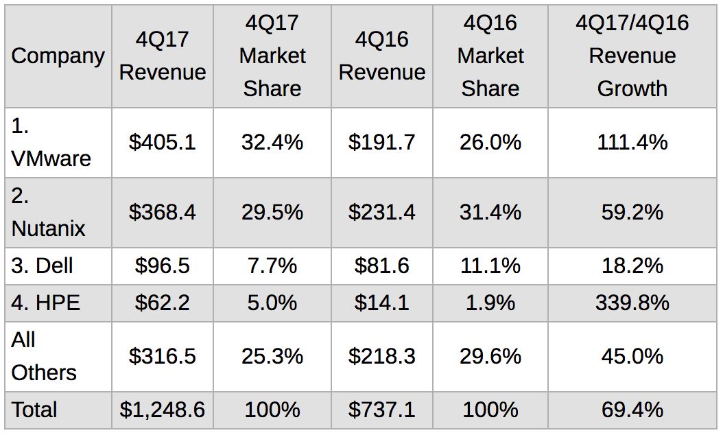 VMware的市场份额从2016年第四季度的26%增长到32.4%,而同期Nutanix的份额从31.4%下降到29.5%。戴尔的份额从2016年第四季度的11.1%下降到7.7%,而同期HPE的份额从1.9%增长到5%。