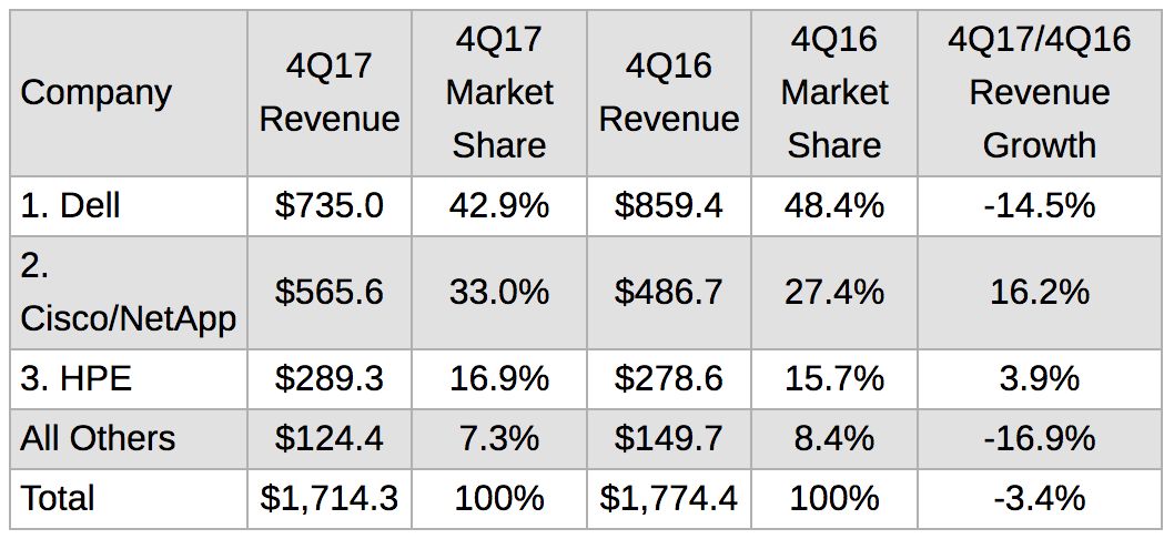 戴尔42.9%的市场份额比2016年第四季度的48.4%这个份额有所下降,当时其收入为8.59亿美元。思科和NetApp的份额从2016年第四季度的27.4%增长到33%,HPE的份额同比增长了近4%,达到16.9%。