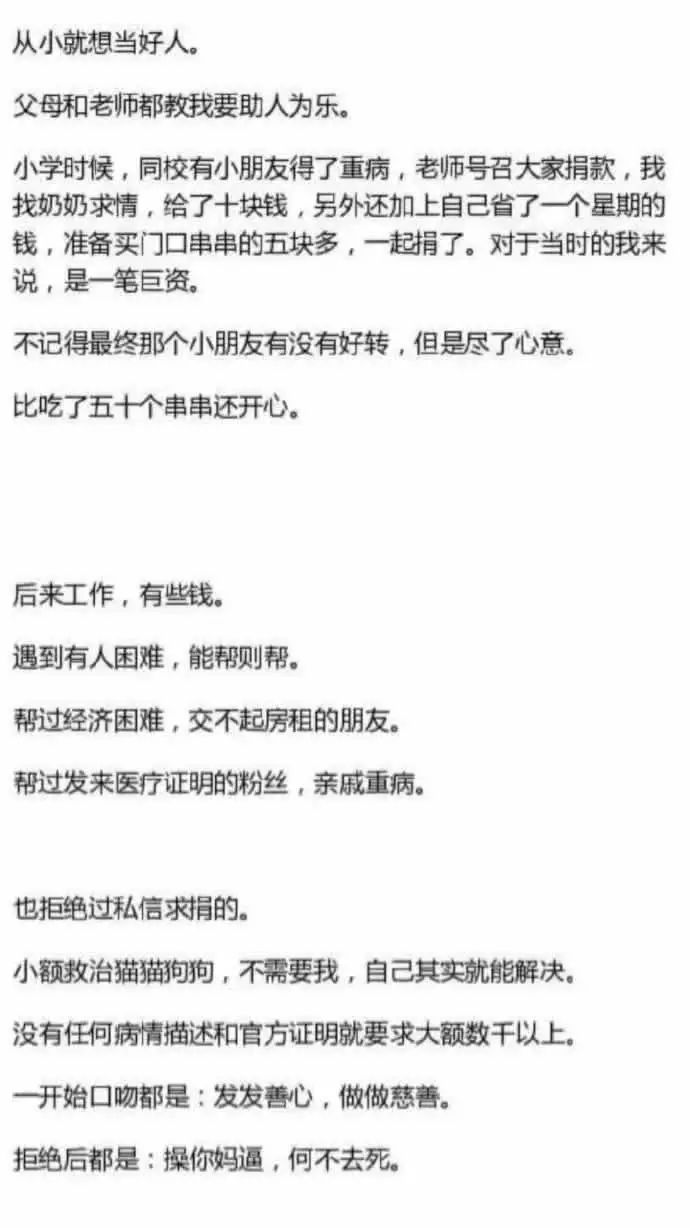 一群没钱的人给身家上千万的人献爱心。人家一套房子就将近千万(7万一平方)有时想起来搞笑。仗义多是屠狗辈,负心多是读书人(国内媒体基本不要脸)。