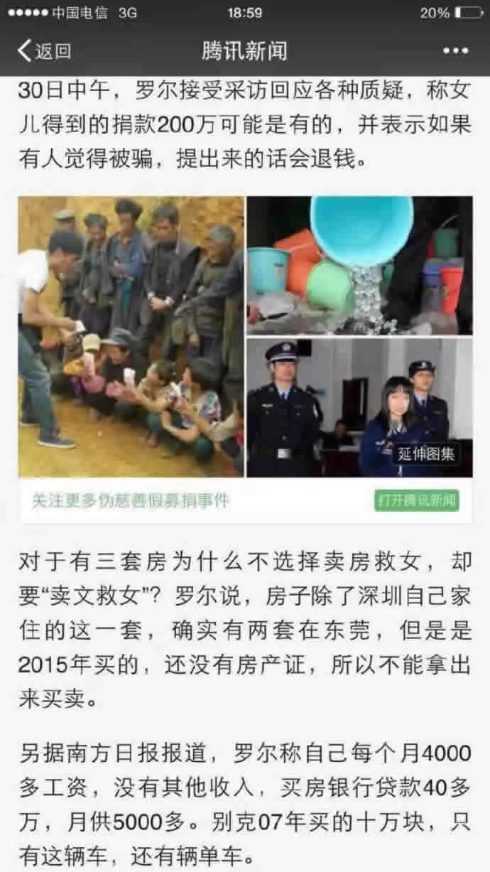 进行此次募捐的当事人罗尔还在四个月前确凿无疑地宣称自己有“三套房、两辆车,还有一家前程无限的广告公司”。要不然月薪4000能买房三套。这剧情小说都写不出来。