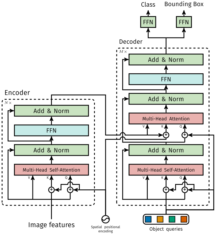 个object query(可以理解为学习不同object的positional embedding)必须是不同,以便产生不同的结果,并且同时把它们添加到每一个Multi-Head Attention中。