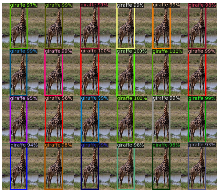 训练集中没有超过13只长颈鹿的图像,DETR实验中创建了一个合成的图像来验证DETR的泛化能力,DERT可以完全找到合成的全部24只长颈鹿。这证实了DETR避免了CNN的归纳偏好问题。
