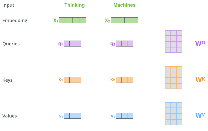 在Scaled Dot-Product Attention中,每个输入单词的嵌入向量分别通过3个矩阵