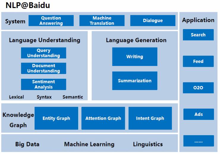 在百度,基于大数据、机器学习和语言学方面的积累,我们研发了知识图谱,我们分析理解query、篇章及情感,我们构建了问答、机器翻译和对话系统。NLP技术已经应用在百度的众多产品上,比如搜索、Feed、o2o和广告等。