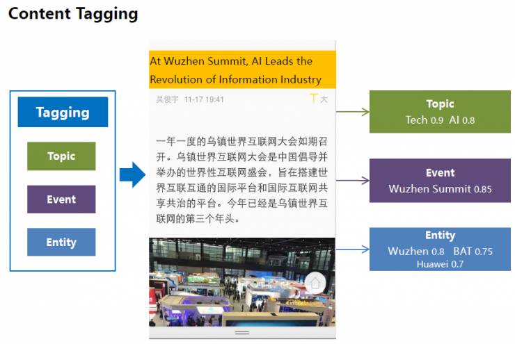 我们给文档打上各种各样的标签,包括:主题、话题和实体标签。主题标签表示抽象的概念,话题标签表示具体发生的事件,实体标签表示人、地点等实体信息。这些标签,从不同角度描述一个文档的内容,以满足不同应用需求,并与不同的query相关联。