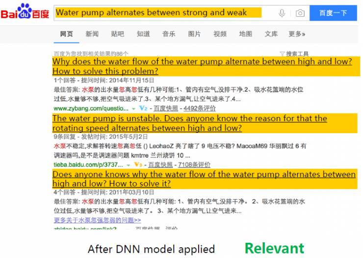 应用了深度学习模型之后,搜索结果里的前3个都是相关性的。从2013年开始应用DNN模型至今,我们已经对这个模型进行了几十次的升级迭代,DNN语义特征是百度搜索里非常重要的一个特征。