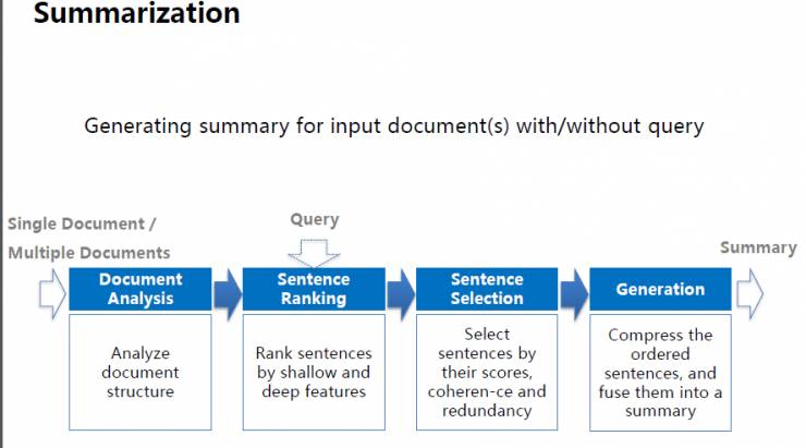 另外,我们还研发了文本摘要技术。具体来说,包括一般的文摘(general summarization)和基于query的文摘(query summarization)如下表中展示的具体过程: