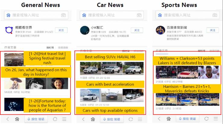 以下是我们自动写作的新闻。左边第一个例子,是一般的新闻,第二个是生成汽车领域的新闻,第三个是体育新闻,目前我们的自动写作系统已经完成了数千篇文章的写作,在百度Feed产品中得以被数百万的用户阅读。