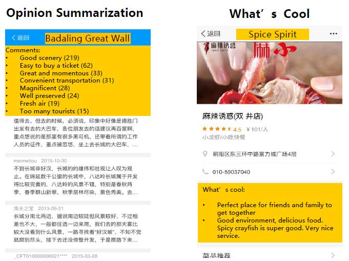 这里是一些关于情感分析应用于百度产品的例子,观点自动摘要技术为用户提供观点标签,在左边的例子里,我们提供了关于“八达岭长城”的多个维度的评价,在右边的例子里,我们在观点分析的基础上为用户提供了精炼的推荐理由。