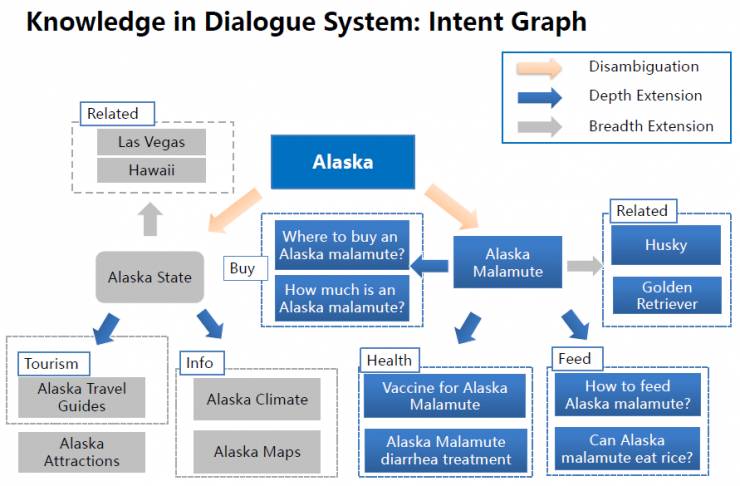 接下来我要谈一谈我们的意图图谱技术。与我之前讲过的实体图谱不同,意图图谱的节点代表一个个意图节点。这些“意图”之间的关系包括需求澄清(disambiguation)、需求细化(depth extension)、需求横向延展(breadth extension )等。在下图所示例子中,当“阿拉斯加”的意思是“阿拉斯加州”时,与之关联的意图是城市、旅游等信息。当“阿拉斯加”的含义是“阿拉斯加犬”时,它延伸的意图是宠物狗、宠物狗护理,以及如何喂食等。