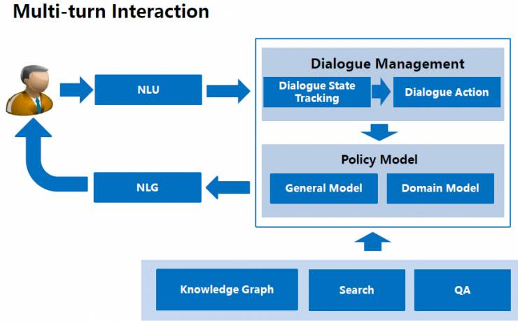 接下来,我会介绍百度的对话系统。该对话系统能与用户进行多轮交互(multi-turn interaction)。首先,用户的输入经过自然语言理解(NLU)模块,进入对话管理系统。该系统识别出当前的对话状态(dialogue state),并确定下一步的对话行为(dialogue action)。我们的对话策略( policy) 模块,包含通用模型和领域模型,即前者负责处理通用的交互逻辑,后者则处理特定领域的交互逻辑。最后,该系统会为用户生成交互回复。