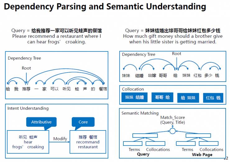右边用户输入的query是“妹妹结婚出嫁哥哥给妹妹红包多少钱”,说明我们是如何提升query和网页之间的语义匹配(semantic matching)。首先,我们基于依存句法分析识别出这条query中的搭配,这种词语搭配相比于单个词语更能够准确表征query的语义,进而可以将其应用到query与网页的精确匹配中。