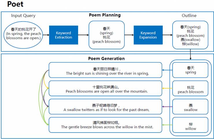 举个例子,如果用户想要写一首和春天有关的诗,那么诗歌规划模型就会首先生成一个内容概要,包括春天,桃花,燕和柳这四个主题,然后由RNN模型根据这四个主题生成四句诗,来完成整首诗歌的创作。