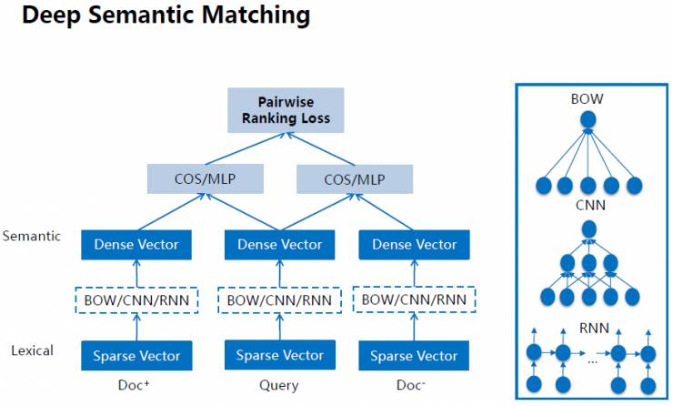我们同样开发了基于深度学习的语义理解技术,实现了一个基于深度学习来计算query和文本语义关联。我们使用了超过1000亿的用户数据来训练模型,对于一个query,包括用户点击过的正例和未点击的负例。我们使用了BOW、CNN和RNN模型来学习语言的语义表示。为了提升模型对语义的表征,我们融合进多种句法和语义结构,将“依存关系结构”融合进模型中。