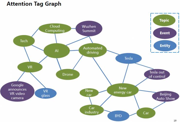 融合了话题标签和实体标签,我们形成了关注点标签图谱。这种关注点标签能更好地描述用户与文档之间的关系,因为它能同时对用户和文档进行表征。我们也在不同类型的关注点标签之间建立关系,这样我们可以对用户关注点进行推理和计算。在下图所示例子里,“AI”话题与“科技”、“VR”等话题及“乌镇峰会”等事件关联在一起。