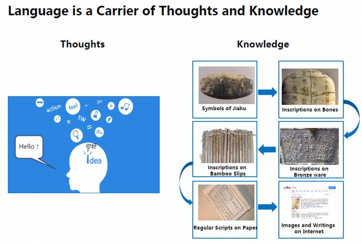 相对于看、听和行动的能力,语言是人类区别于其他生物最重要的特征之一。语言是人类思考的载体,通常我们的思考语言是母语。当我们学习外语时,老师希望我们要努力使用外语来思考。另一方面,从人类历史之初,知识就以语言的形式进行记录和传承,用来书写语言的工具不断改进:从甲骨到纸张,再到今天的互联网。