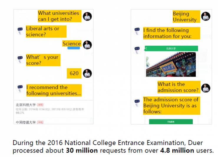 这里有一个例子,是高考之后,百度智能助理“度秘”和用户之间的对话。当用户问:“我能进入哪所大学?”度秘会反问他问题,以进一步了解情况。度秘问:“你是文科还是理科?”对方回答:“理科”。度秘接着问:“你考了多少分?”他回答:“620 分。” 度秘随即根据这些信息,推荐适合他填报志愿的学校。在 2016 年的全国高考期间,度秘处理了480 万百用户的 3000万个请求。