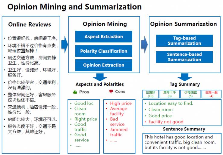 情感分析是篇章理解里另一个有趣的话题。情感分析技术也被称为“观点挖掘”(opinion mining),用来分析人类对各种对象(比如产品、组织机构等)的观点、情感和情绪。下面是我们在“观点挖掘”和“观点摘要”方面的一些工作。以“酒店评价”为例子,我们从已有的在线评论数据中抽取评论句,并进而从中提取用户观点。基于这些观点,我们可以生成标签级的观点摘要和句子级的观点摘要。我们也可以以此为基础来进行酒店推荐。