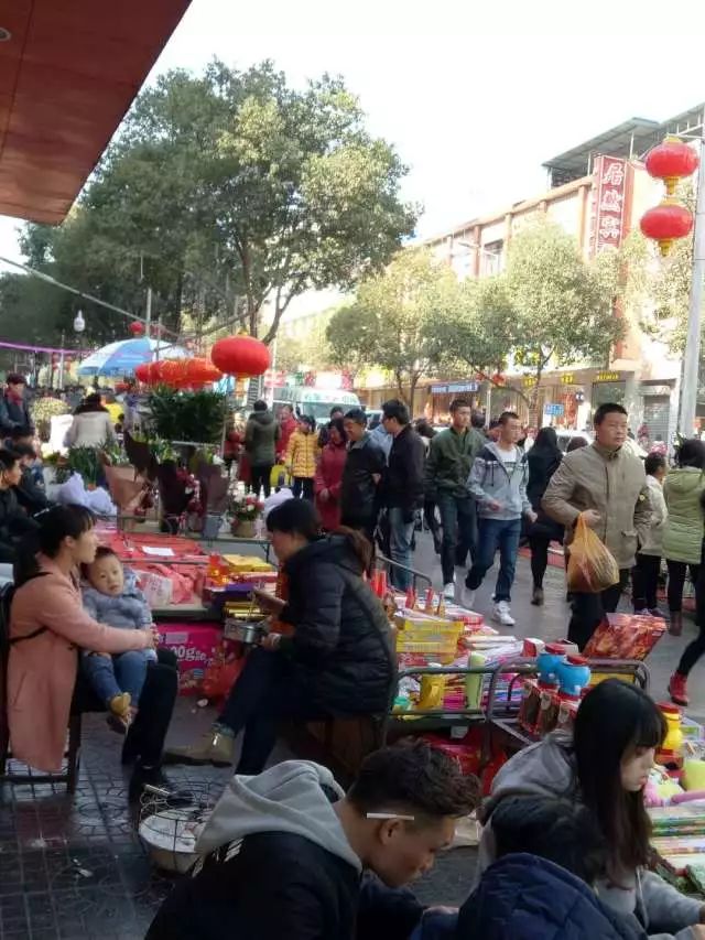 各种卖对联、福字、烟花爆竹、鲜花、灯笼、门神等等充满了年味儿的物件儿簇拥在街道上。