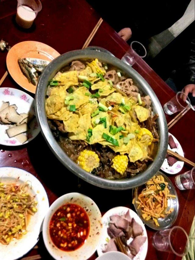 家里的传统菜色便是下图的这一盆大菜,名叫蒸盆子。除了底下的炖菜之外,最为精华的要数最上面的蛋饺。