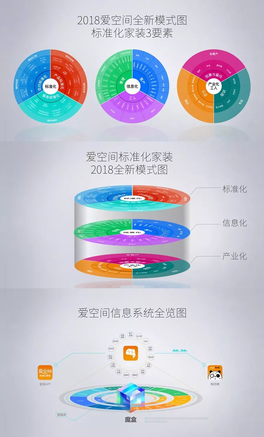 目前,爱空间标准化信息系统由爱空间APP、爱聊儿APP、熊师傅APP组成。19个系统在背后支撑着它们。这19系统分别是CRM客户关系管理系统、CMS内容管理系统、公众号、小程序、官网、设计系统、魔术家、管家系统、工人系统、质检系统、售后系统;SCM采购系统、WMS仓库管理系统、TMS运输管理系统、VRM供应商系统;基础数据系统、商品系统;BI系统;财务系统。