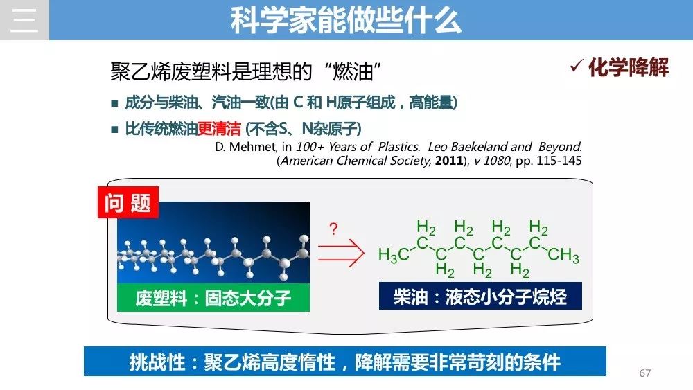 讲座上他还详细讲解了他最感兴趣的研究方向之一:烷烃资源的高效利用。“绿色化学是我们研究遵循的核心理念。虽然之前也有办法将聚乙烯废塑料降解,但涉及到高温、产物选择性差等各种问题,我们通过催化剂的介入可以在温和的条件下选择性生成清洁的柴油。”