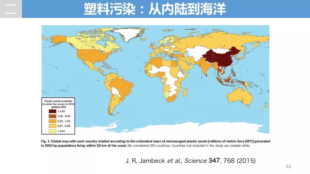 美国佐治亚大学研究组在2015年2月13日发行的美国《科学》杂志上发表的统计结果显示,全球每年流入海洋的塑料垃圾达480万至1270万吨。中国以每年132万至353万吨居于首位,印度尼西亚以48万至129万吨排在第二,菲律宾以28万至75万吨排在第三。塑料垃圾已经给人类的生存环境乃至整个地球带来了危害。