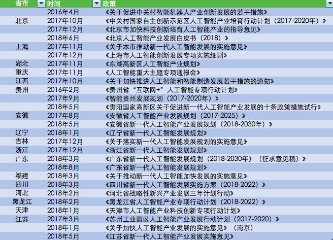 除此之外,国内各地方政府对人工智能的重视度也呈升温趋势,并相继出台 AI 发展规划。从 2016 年开始,北京、江苏、贵州等地方政府最先出台了 AI 相关的发展规划的政策。据不完全统计,截止到今年 10 月,全国已有 20 个省市推出新一代人工智能发展规划。