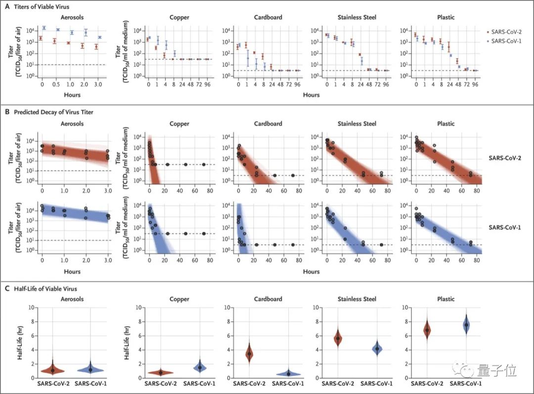 文章的作者测试了现在的新冠病毒(SARS-CoV-2)和过去的SARS病毒在5种条件(气溶胶和4种表面)的存活时间,并使用贝叶斯回归模型估算了这两种病毒的衰减率。