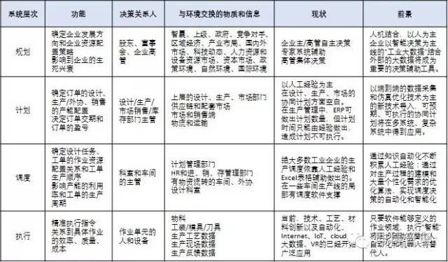 以制造工厂为例,我们可以把四个层次的决策系统功能、特征等列出一张表格。