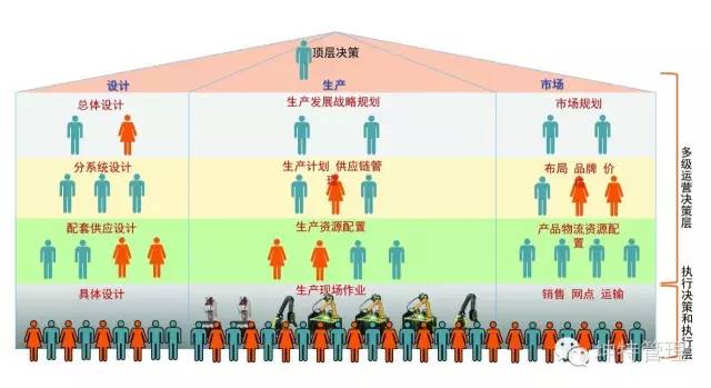 我们在一个工业运营系统的简图里标出了人在系统中的位置。既然人在这个工业系统中存在两个领域的角色,那么工业领域的“智能”必定包含了决策智能和执行智能。这是两个层面的事情。智能决策和智能执行是实现智能制造的不可或缺不可分离的两个重要方面。我们不能将决策和执行割裂去独立研究决策层或研究执行层,也不能将决策和执行混同在一起。在当前我国实施智能制造战略中,尤其不能缺少、弱化在智能在决策领域中的研究,