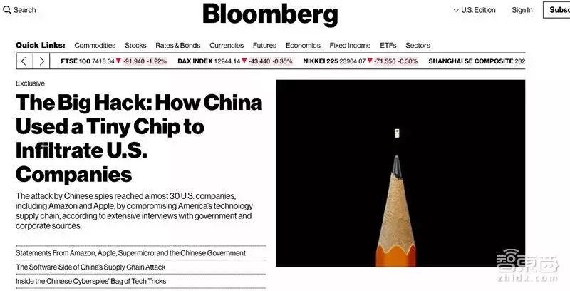 这篇文章题目为《The Big Hack: How China Used a Tiny Chip to Infiltrate U.S. Companies(大黑客:中国如何用迷你芯片入侵美国公司)》,据文章显示,近30家美国IT公司,被如图所示的一枚不到铅笔尖大小的中国芯片给攻击了。