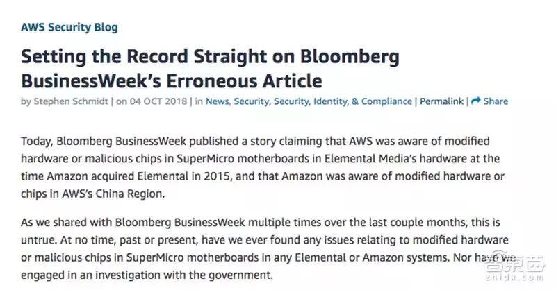亚马逊在声明中表示: “过去或现在,我们都没有在任何Elemental或亚马逊系统的SuperMicro主板中发现与修改的硬件或恶意芯片有关的任何问题。我们也没有与政府进行调查。”