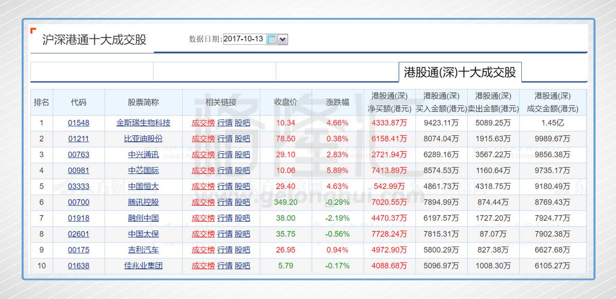 今日港股通(深)前十大成交个股是金斯瑞生物科技、比亚迪股份、中兴通讯、中芯国际、中国恒大、腾讯控股、融创中国、中国太保、吉利汽车、佳兆业集团。其中净流入最多的个股是中国太保,净流入7728.24万,前十大成交中无净流出个股。