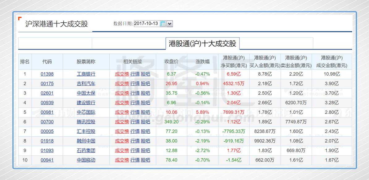 今日港股通(沪)前十大成交个股是工商银行、吉利汽车、中国太保、建设银行、中芯国际、腾讯控股、汇丰控股、融创中国、石药集团、中国移动。其中净流入最多的个股是工商银行,净流入6.59亿;净流出最多的个股是中国移动,净流出1.54亿。