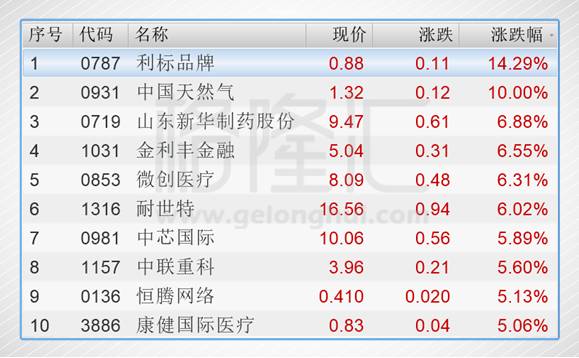 今日港股通标的中涨幅前五的个股是利标品牌(00787.HK)、中国天然气(00931.HK)、山东新华制药股份(00719.HK)、金利丰金融(01031.HK)、微创医疗(00853.HK)。