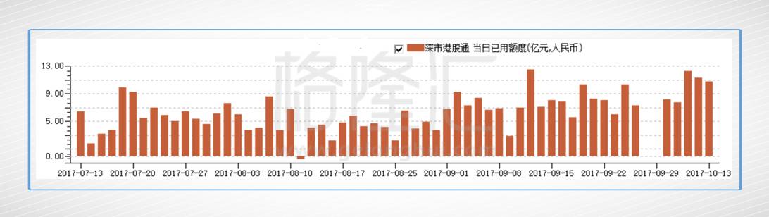 港股通资金全天净流入32.48亿元,这是自9月7日以来首次站上30亿元上方(其中港股通(沪)净流入21.69亿元,港股通(深)净流入10.79亿元),港股通今日共成交110.88亿元,占总成交额的比重为6.4%。整体来看,从10月9日至今(本周),港股通资金净流入额在呈明显的逐步增加态势,净流入总额达131.16亿元。
