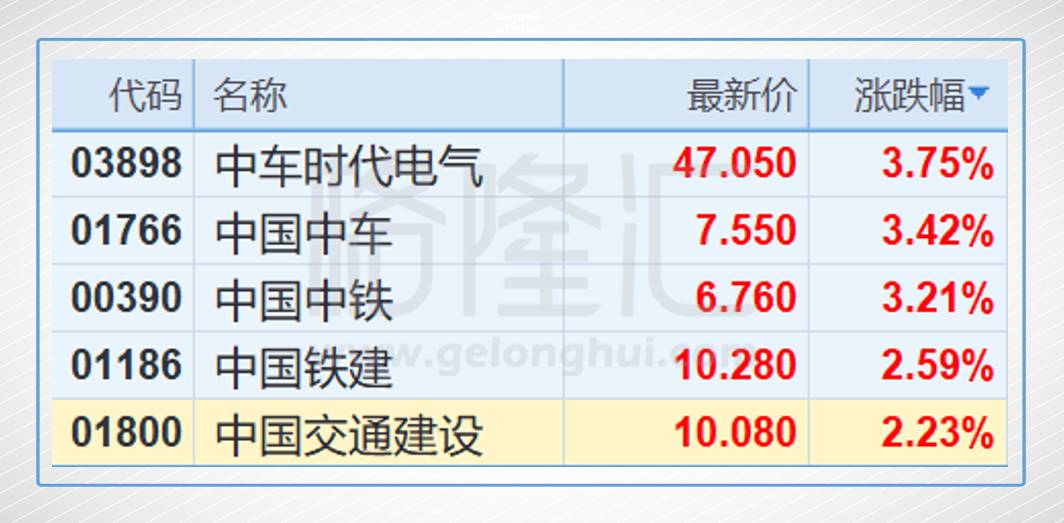 此外,高铁基建股全线爆发,中国中车(01766.HK)涨3.42%;中国中铁(00390.HK)涨3.21%;中国铁建(01186.HK)涨2.59%,中国交通建设(01800.HK)涨2.23%。