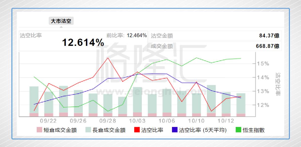 港股今日沽空金额84.37亿港元,大市沽空比率12.615%,较上一个交易日(12.464%)升0.151%。