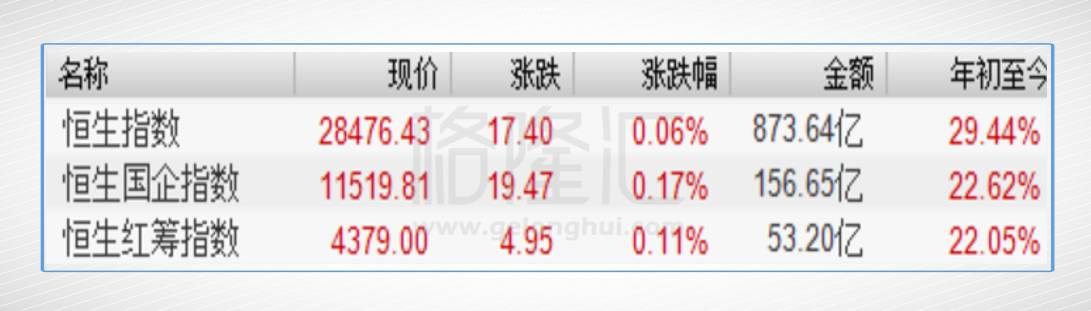 周五港股市场三大指数纷纷收涨,其中恒指收报28476点,涨0.06%,本周涨0.06%;国企指数收报11519点,涨0.17%,本周涨0.53%;红筹指数收报4379点,涨0.11%,本周跌0.71%。大市全天共成交873.64亿港元。