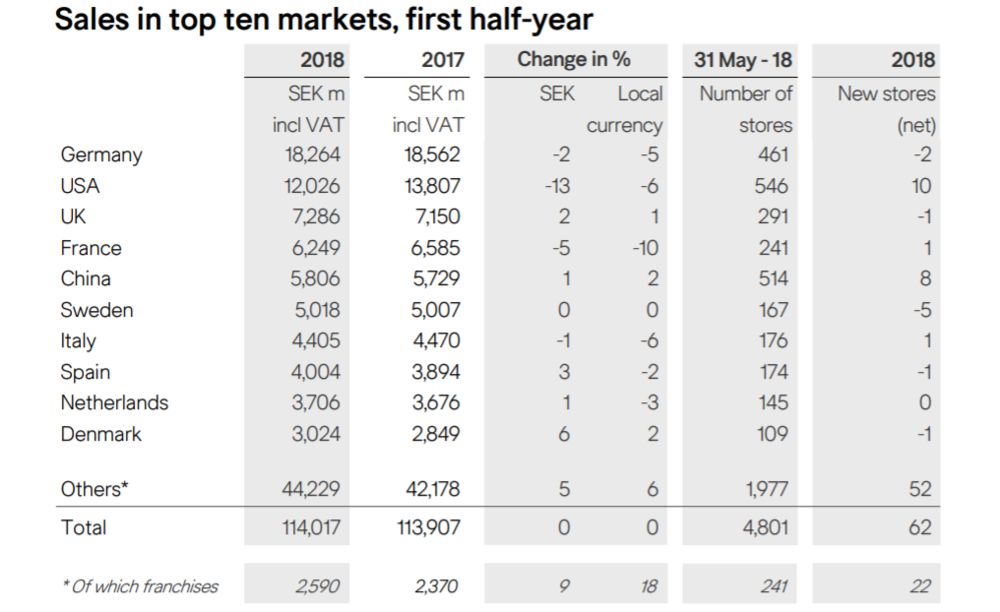 促进销售或处理存货,无外乎营销活动和打折手段,2018上半年其毛利率为53.2%,比去年同期54.7%下降1.5个百分点,显然H&M降低了售价。