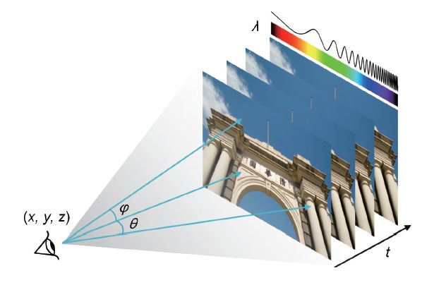 光信号的表征具有多种维度。1991年,美国麻省理工学院的Adelson提出了七维全光函数模型F(x,y,z,θ,φ,λ,t)对真实的光信号进行描述,如图2所示,其中x,y,z,代表三维空间的任意位置,θ,φ 代表光信号的传播方向,λ代表所采集光信号的光谱信息,而t则代表光信号捕获的时刻。但是信号采集器,如CCD和CMOS是一个低维离散采样系统。经典成像模型描述的是七维全光函数的一个二维投影子空间采样,即高维连续信号经过相机采样得到的结果是低维耦合离散信号,获取高维信号的能力受到很大限制。如何对高维数据进行高速、海量、保真、高效的采集和恢复,是成像领域无数科研工作者追求的目标。传统成像系统获取高维信号的方式时,都是惯性地将不同维度的信号进行分离后采集,造成数据采集的规模过大,对硬件采集端的能力提出了极高的要求。过去计算机的计算能力有限,高维信号获取依赖于硬件端的采集能力。但是硬件采集能力的发展强烈依赖于材料科学和基础物理科学的发展,很难在短时间获得提高。根据摩尔定律,芯片的计算能力将在很长时间内能够保持指数级的增长。计算能力的增长速度远高于探测器采集能力的增长速度,促使得越来越多的科学家寻求通过硬件编码的方式将高维信息投影到低维的采集器件上,再利用强大的计算能力对高维信息进行重构。