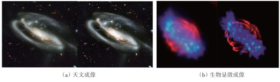 随着计算能力普及和提升,反卷积的方法被用于提高图像分辨率中。反卷积方法是基于一般光学系统都可以近似成线性无偏移模型,点扩散函数可以描述系统的成像机制,通过对系统点扩散函数的评估,可以提高重构图像的分辨率。其中最典型的应用莫过于哈勃望远镜拍摄的畸变图像经过反卷积处理后,分辨率获得了极大提高。随后,超分辨率技术获得了持续高速的发展,在天文成像、遥感成像、计算机视觉、医学X线断层、生物显微成像等几乎所有成像领域发挥着重要的作用,特别是2014 年度诺贝尔化学奖获奖成果——超分辨率荧光显微技术。由于点扩散函数过大,经典的显微成像系统无法分辨距离小于艾里斑半径的2个点,但超分辨率荧光显微技术利用非线性技术,使得点扩散函数变小,再利用反卷积方法实现高分辨率成像,例如,受激发射光淬灭技术(STED);或使用单分子荧光技术,使得靠得很近的2个点不同时发光,再利用反卷积实现高分辨率成像,例如,光活化定位显微镜(PALM)和随机光学重构显微镜(STORM)。图1(a)显示了反卷积在天文成像中的应用,图1(b)显示了反卷积在生物显微成像中的应用。