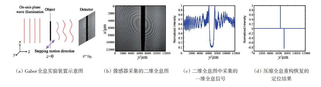 美国麻省理工的Barbastathis团队采用天然的光波衍射压缩模型,有效地实现了对“x”维度的数据压缩,同时梯度边沿约束地引入,使得信号的稀疏度最大化,实现对已知物体的高精度定位(图4)。图4(a)为实验装置示意图,工作使用了最简单的Gabor 全息模型。图4(b)为实验中像感器采集到的二维全息图,从中提取的长度为1024的一维矢量信号如图4(c)所示。利用压缩感知算法可以成功恢复物体的边沿信息,恢复结构有效地去除了共轭噪声和其他系统噪声对结果的影响。实验中,物体的定位精度达到1/45个像素(相当于267 nm)。随后,Barbastathis团队将该方法扩散到二维的物体亚像素定位中,利用压缩全息实验对数据“x,y”两个维度的压缩,同时通过高精度螺旋相位板的引入,增加压缩测量矩阵的随机性,提高压缩全息的重构精度。