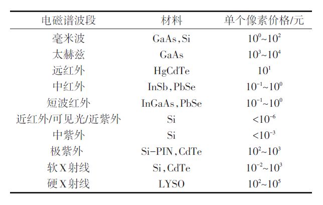 表1 不同电磁谱波段上探测器元件单个像素价格估计