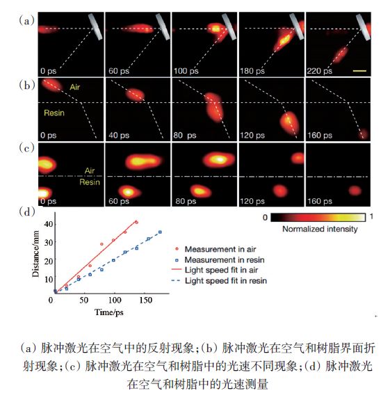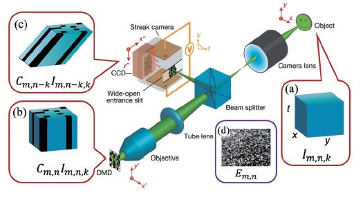 当成像器件成本过高时,利用压缩成像技术,提高重构成像数据的维度和分辨率是一个明智的选择,高速摄影技术就是如此。基于硅基的超高速像感器件,最高成像速率可以达到每秒千万帧,但是由于传输带宽的限制,每秒仅仅输出几十帧甚至几帧的图像信息。其他成像速度更快的系统大多是通过中继系统将不同帧的图像信息分离,并在多个像感器上进行采集。条纹相机作为一种典型的高速相机,其原理是不同帧的光子经过狭缝轰击光电阴极,产生的电子在高压电场的作用下发生偏转,最后在荧光屏幕上显示。条纹相机虽然可以获得千亿帧的高速成像,但其原理是牺牲了图像的横向分辨率,将不同帧的图像信息编码到空间中。因此条纹相机要求物体具有很高的重复性,通过平移狭缝的位置,最终获得二维图像的高速成像,但是很多物理和化学研究往往不满足实验现象高度可重复的要求,美国圣路易斯华盛顿大学的Wang团队巧妙利用条纹相机的剪切特性,对进入条纹相机中的图像进行随机编码,实现了“t”维度的数据压缩。图7为压缩高速摄像系统的示意图。目标图像的数据体可以表示为图7(a),其中x和y为空间维度,为时间维度,m、n、k表示数据体矩阵系数,目标图像经过中继成像系统映射在数字微镜元件(DMD)上,此时的数据体可以表示为图7(b);经过光学系统传输进入狭缝完全打开状态的条纹相机,条纹相机中的电场作用相当于对数据体剪切(图7(c));最终荧光屏上采集到的图像为不同帧的数据压缩编码的结果(图7(d))。压缩高速摄像系统结合了条纹相机的剪切作用和压缩感知孔径编码的原理,在硬件层面上实现了不同帧数据压缩,使得条纹相机可以在一次曝光的条件下,实现1000亿帧的高速成像。图8为利用该高速相机捕获的现象。