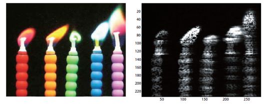 虽然杜克大学的Brady课题组使用光的衍射模型作为数据压缩测量矩阵,减低了器件的成本和实验校准难度,但是该模型形成的压缩矩阵随机性和非相干性较低,无法实现高效压缩数据编码。因此,Brady开发了新的基于编码孔径的单次曝光光谱成像(coded aperture snapshot spectral imager,CASSI)系统,实现压缩感知技术对“λ”维度的数据压缩。传统的光谱成像系统先通过色散器件将不同光谱通道的光进行分离,再对不同通道光谱进行成像,而CASSI系统是利用编码孔径对场景中不同通道光谱进行随机编码和压缩,仅采集一幅灰度图像,就可以恢复多通道的光谱信息,从而大大降低信号的采集量。图5为利用彩色相机记录的蜡烛燃烧图和经过CASSI系统后的单色编码图。图6为Brady课题组利用CASSI系统恢复的多光谱彩色图像,实验中共采集了300帧的视频数据,利用NeAREst压缩重构算法对每一帧图片进行重构,可获得从455~650 nm的107个光谱通道图像,图6中只显示其中的33个光谱通道。