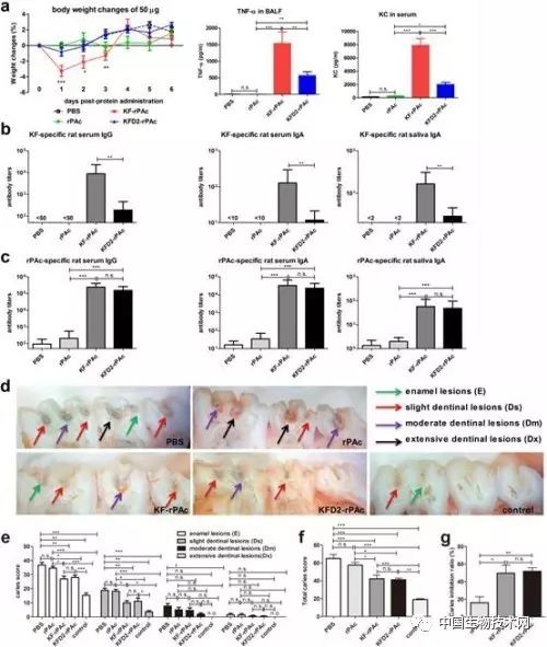 第二代重组融合蛋白抗龋疫苗—KFD2-rPAc大大降低了可能的系统性炎症反应(a)、鞭毛素本身的免疫原性(b)、但保留了良好的诱导rPAc特异性免疫应答的能力(c)以及高效的抑龋活性(d-e)。