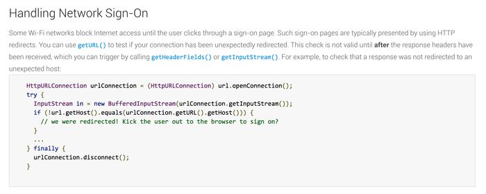 Android端的检测也可以采用这样的方式,具体可参看google的文档:https://developer.android.com/reference/java/net/HttpURLConnection.html ,其中提到的判断机制如下: